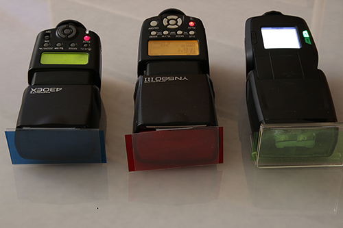 Auf die Blitze werden Farbfolien aufgesteckt, die Blitzleistung wird auf