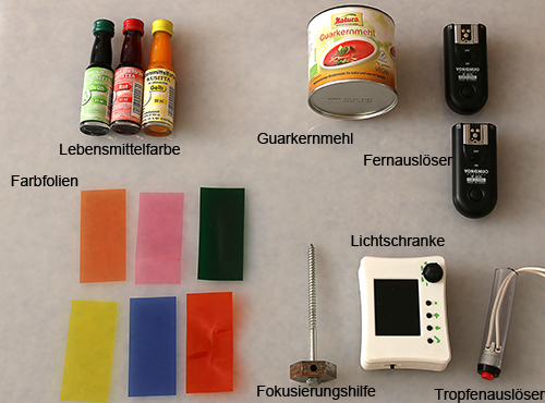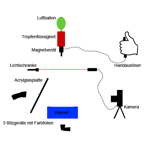 Rückstrahlplatte. Fernauslöser in der Hand und dann tropfen lassen.