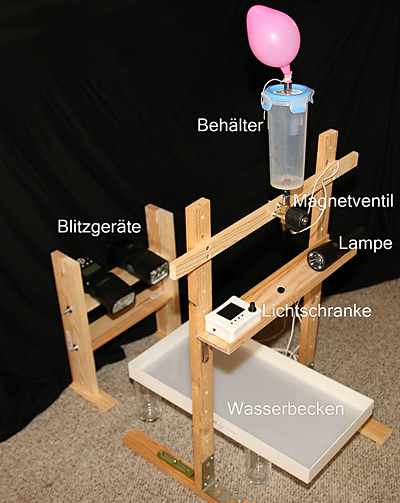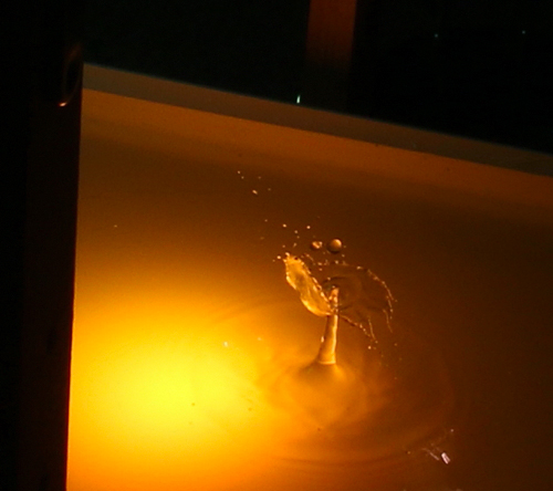 habe, sind da schon mal 10 oder 20 Bilder nichts geworden. Das Auslösen des Magnetventiles ist von Hand, der zweite Tropfen fällt schief oder