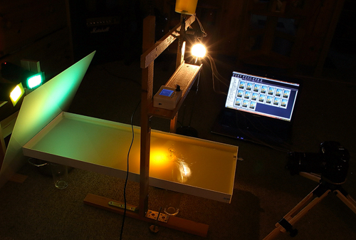 Lichtschranke und Lampe auf Pappkartons. Ein Wasserbecken lag darunter. Meine ersten TaT ' s habe ich dann so fotografiert. In der Nacht